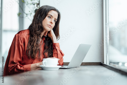 contemplative, woman, laptop, cafes, copy space, technology, 1, people, computer, communication, adult, business, day, casual attire, hot drink, cup, saucer, refreshment, wireless, connection, pensive, sitting, shirt, blouse, businesswoman, female, freelancer, occupation, job, mid, table, contemplation, brown hair, caucasian, lifestyle, looking, drink, shop