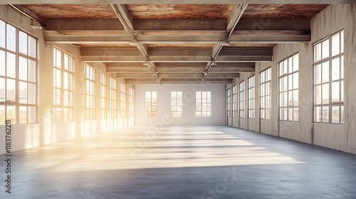 Contemporary art gallery with blank walls and industrial ceiling on a bright day