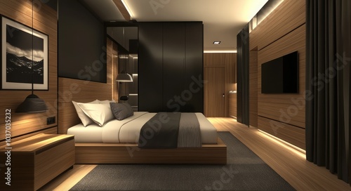 Contemporary Bedroom Interior. Stylish Design with Wooden Elements and Classic Touch
