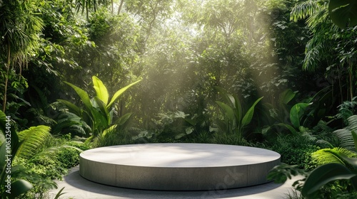Contemporary circular concrete pedestal surrounded by vibrant greenery for showcasing products