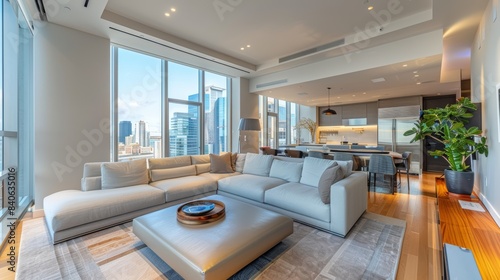 Contemporary city apartment with panoramic views, open-concept living space, and upscale furnishings.