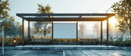Contemporary city bus stop with blank billboard, sleek bench inside glass shelter