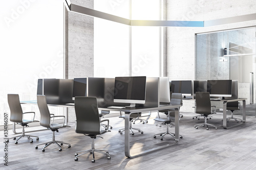 office, interior, modern, three-dimensional, business, rendering, room, computer, illustration, background, view, architecture, white, loft, work, nobody, floor, window, design, workplace, space, wall, ceiling, glasses, concrete, equipment, sideview, side, desk, table, chair, real, estate, inside, indoor, reflections, daylight, city, workspace, clean, corporate, technology, lamp, roomy, new, contemporary, render