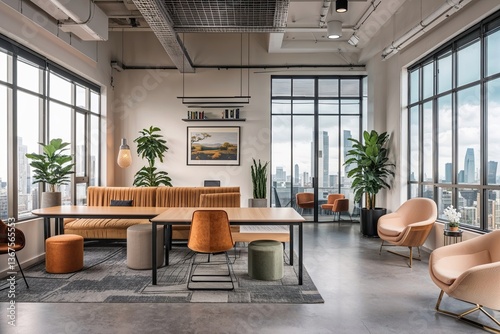 Contemporary Co-Working Office Space Design with Modern Furnishings and Large Windows