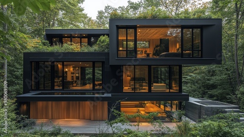 Contemporary cube house with expansive rooftop greenery, natural wood, steel exterior, huge floor-to-ceiling windows, sustainable architecture nestled in nature