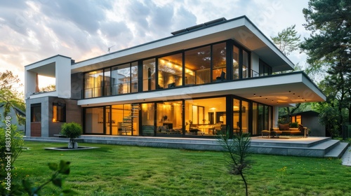 Contemporary home exterior with large windows and a minimalist design.