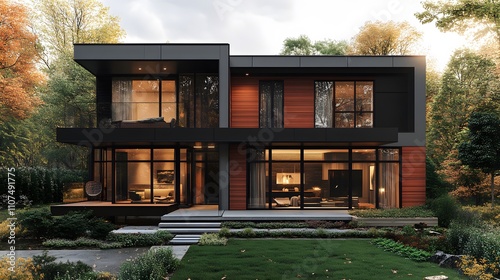 Contemporary house exterior featuring geometric design with wood and metal cladding. Minimalist facade combines black metal panels and warm wood siding with large window elements.
