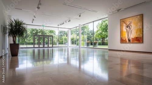interior, space, gallery, museum, architecture, modern, art, painting, exhibition, design, light, beige, floor, window, tree, green, daylight, polished, contemporary, empty, photographic, commercial, editorial, poster, hallway, open, clean, modernism, minimalist, elegant, image, background, empty space, copy space, interior design, display, lighting