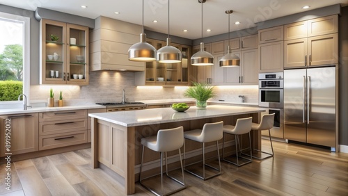 kitchen, modern, contemporary, sleek, cabinetry, quartz, countertop, stainless, steel, appliance, pendant, lighting, neutral, tone, design, architecture, decor, minimalist, stylish, elegant, chic, sophistication, simplicity, clean, line, geometric, shape, texture, material, sharpened, attention, detail, style, flair, luxury, comfort, functionality, versatility, roomy, airy, natural, light, warmth, inviting, cosy, modernity, futurism, technology