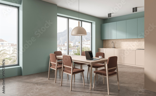 Contemporary kitchen interior with mint green walls, pastel cabinets, and wooden dining table, mountain view in background, clean minimal design. 3D Rendering