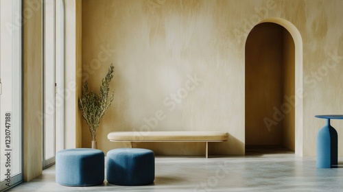 modern, living, room, interior, design, minimalist, decor, neutral, tone, large, window, natural, light, blue, ottoman, wooden, bench, cylindrical, stool