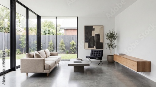Contemporary minimalist living room with elegant furniture, abundant natural light, and a serene indoor-outdoor connection, showcasing sophisticated residential interior design