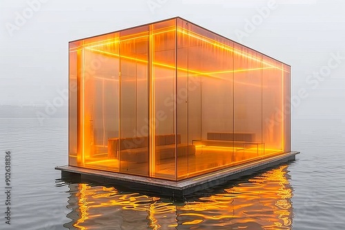 contemporary, orange, glasses, house, floating, serene, water, minimalist, design, peaceful, lakeshore, setting, warm, vibrant, tone, modern, architecture, tranquil, nature, harmony, innovative, structure, unique, simplicity, scenic, water, home, bright, colours, sunset, stylish, waterfront, elegance, creative, transparent, architectural, concept, high-coloured