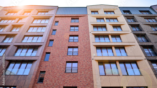 Contemporary residential building exterior in the daylight. Modern apartment buildings on a sunny day with a blue sky. Facade of a modern apartment building