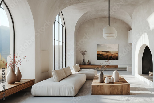 Contemporary Scandinavian and Mediterranean-Inspired Living Room Interior: A Minimalist and Cozy Design Featuring Stone Walls, Modern Furniture, White Decor, and Rustic Elements. Includes a Comfortabl