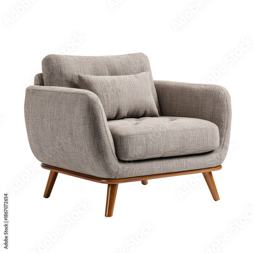 armchair, chair, furniture, modern, contemporary, fabric, upholster, taupe, brown, beige, comfortable, cushion, pillow, wood, leg, tapered, sleek, design, interior, home, living room, single, elegant, cosy, stylish, seating, accent, texture, studio, domestic