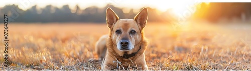 Content dog resting in an empty, sun-filled field, Companion, Empty and Light concept