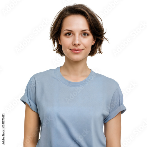 woman, portrait, smiling, blue, t-shirt, short hair, happy, cheerful, face, beautiful, beauty, person, female, smile, attractive, looking, head shot, model, girl, expression, casual attire, people, brunette, studio, lady, happiness, standing, teenage, hair, 1, cute, fashion, posing, student, teenage