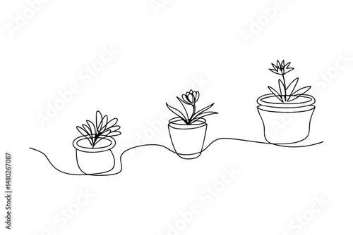 Continuous line drawing of plant growth stages in pots on a white background