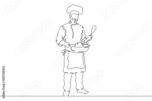Continuous one line drawing Male chef in a hat. Chef in the kitchen. The cook is cooking.One continuous line isolated minimal illustration.Not AI.