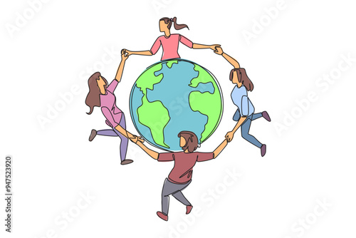 Continuous one line drawing a group of women make a circle around the globe. Be happy and cheerful in keeping nature in good condition. Protect the world. Single line draw design vector illustration