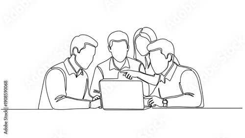 team, collaboration, people, laptop, computer, screen, meeting, work, office, business, group, teamwork, colleague, discussion, brainstorming, project, communication, cooperation, minimal, minimalist, continuous, drawing, illustration, vignetting, outline, artistic, elegant, modern, simple, aesthetic, decorative, vector, silhouette, organic, natural, professional, corporate, digital, technology, innovative, strategy, planning, productivity, leadership, connection, network, linear, contour, workplace
