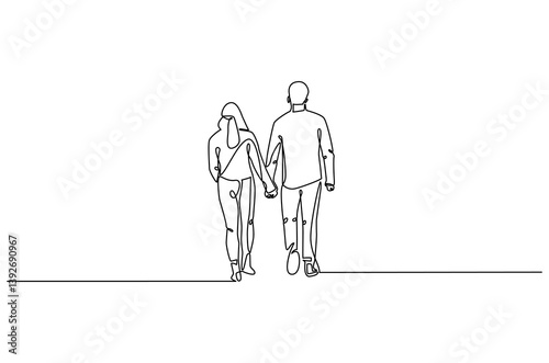 Continuous one line drawing of young Couple Walking Together. Single line drawing illustration of romantic back view couple holding hands. Romance concept vector art. Doodle line illustration.