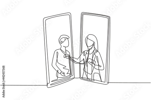 Continuous one line drawing two smartphones facing each other with female doctor checking heart rate of male patient using stethoscope. Online doctor. Single draw design vector graphic illustration