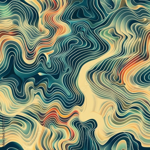 contour, wave, seamless pattern, teal, beige, topographic, hypnotic, intricate, depth, movement, dynamic, modern, sophisticated, home decor, fashion design, complexity