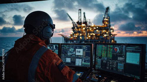 control, room, operator, offshore, oil, rig, sunset, technology, teamwork, marin, industry, monitoring, equipment, screen, safety, ocean, men at work, energy, night, communication, machinery, professional, environment, sea, platform, operation, datum, engineering, management, remote, navigation, construction, power, surveillance, labor, skill, innovation, resource, infrastructure, maritime, exploration, gear, hard, hat, headset, digital, system, analysis, performance