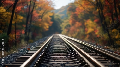 Converging Railway Tracks Through a Blazing Autumn Forest with Dreamy Bokeh