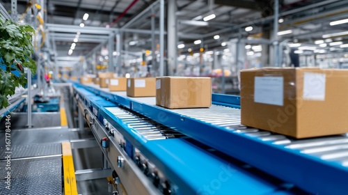 Conveyor belt transports packages in a modern warehouse during daytime operations