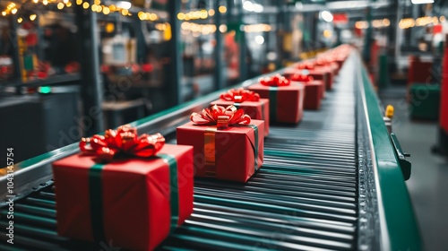 Conveyor belt with wrapped gifts symbolizes efficient holiday logistics.