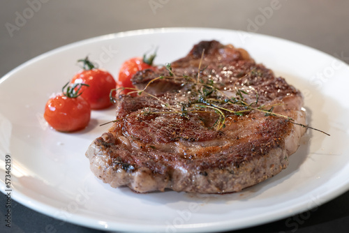 Cooked and grilled steak on white dish with a little tomato with it, ready for the next decoration step.