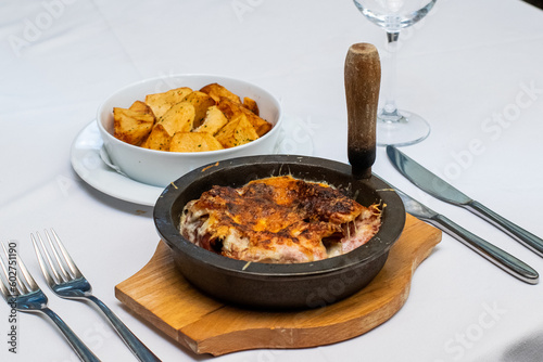 Cooked meat lasagna in black dish with baked potatoes in restaurant