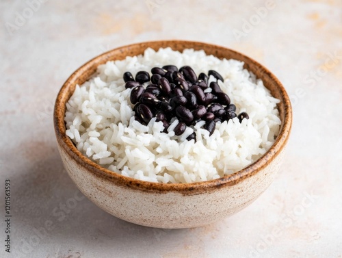 Cooked rice with beans in a bowl. Steamed white rice mixed with black beans in a ceramic bowl. Emphasizing nutrition and cultural cuisine. Ideal for food blogs and health recipes.