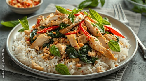 Cooked rice with stir-fried sliced chicken breast and basil.Thai food . Generative Ai