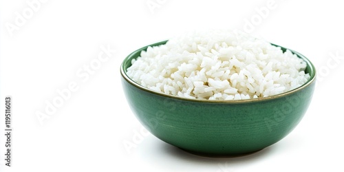 Cooked Thai jasmine rice in a green bowl centered against a bright white background with ample negative space ideal for text or design.