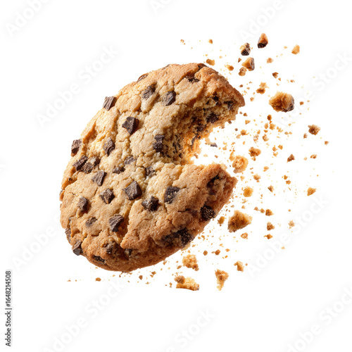 cookie, biscuit, bite, crumb, flying, scatter, dessert, sweet, snack, baked, bakery, chocolate, chips, crunchy, tasty, delicious, sugar, treat, food, round, crispy, homemade, pastry, indulgence, gold, brown, isolated, white, background, break, eating, broken, closeup, macro, still life, appetising, sweet tooth, crumble, cut-out, transparent
