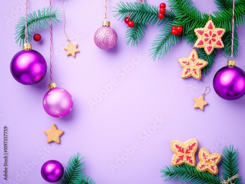 Cookies and various Christmas ornaments arranged neatly on a purple background, perfect for seasonal greetings, copy space, seasonal
