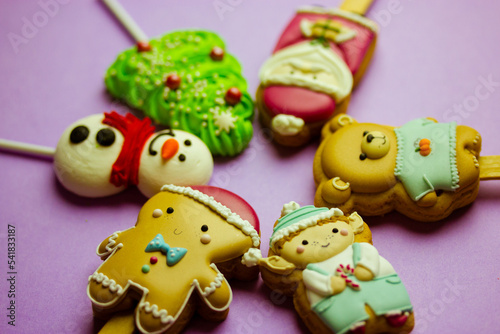 Cookies on sticks in a shape of Santa Claus, elf character, Gingerbread man, snowman, bear, New Year 2023 tree, lollipop on purple background top view. Cute treats, sweets, candies for Christmas fun.