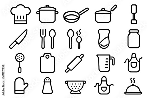 cooking, kitchen, culinary, food, receipe, gastronomy, icon, set, collection, line, outline, symbol, vector, chef, eatery, menu, cookware, kitchen utensile, utensil, cook, pot, pan, knife, spoon, fork, apron, hat, bake, preparation, eat, dinner, simple, minimalist, graphic, illustration, editable, stroke, baking, frying, equipment, home, professional, board, rolling pin, mitt, colander, shaker, jar