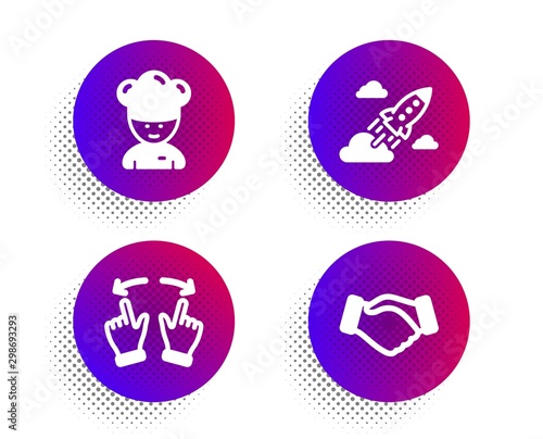 Cooking chef, Move gesture and Startup rocket icons simple set. Halftone dots button. Handshake sign. Sous-chef, Swipe, Business innovation. Deal hand. Business set. Vector