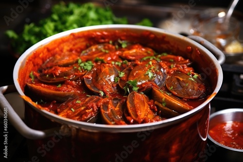 cooking pot full of steaming mussels in marinara sauce