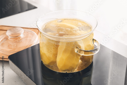 Cooking pot with boiling potatoes on electric stove