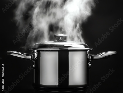 pot, steam, cooking, stainless, covering, kitchen, cookware, preparing, boiling, food, hot, metal, indoor, studio, black, background, lid, shiny, silver, handle, vapour, white, smoke, rising, heat, kitchen utensile, equipment, container, metallic, nobody, domestic, object, closeup, home, meal, cookery, dinner, lunch, household