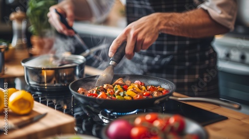 cooking, food, kitchen, chef, vegetable, meal, pan, preparing, dining, culinary, kitchen utensile, receipe, ingredient, gastronomy, art, apron, spatula, hand, cook, delicious, tasty, healthy, epicure, dinner, breakfast, lunch, preparation, styling, home, dish, utensil, photo, pot, saucepan, counter, fresh, tomatoes, yellow, red, green