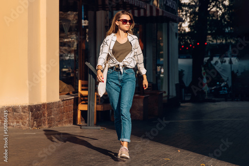 Cool girl with shopper bag walks on a sunny city street in sunglasses and casual clothing. The sun shines on the girl. Sunny day in the city.