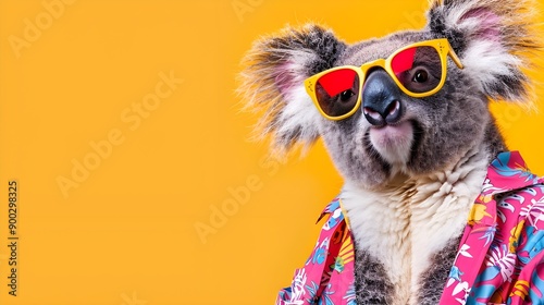koala, animal, mammal, australia, wildlife, sunglasses, fashion, cute, funny, adorable, portrait, closeup, head shot, fur, eye, nose, mouth, teeth, ear, paw, tropical, shirt, summer, vacation, holiday, travel, adventure, fun, joy, happy, casual attire, relaxed, lifestyle, fauna, nature, yellow, pink, orange, background, studio, photo, colours