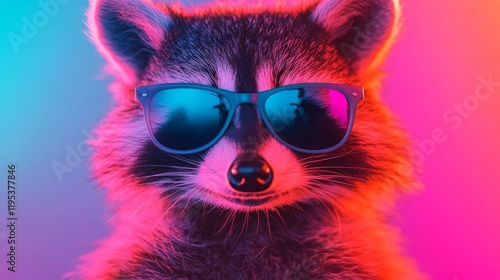 Cool raccoon in sunglasses against a vibrant pink and blue background. A fun, stylish image.